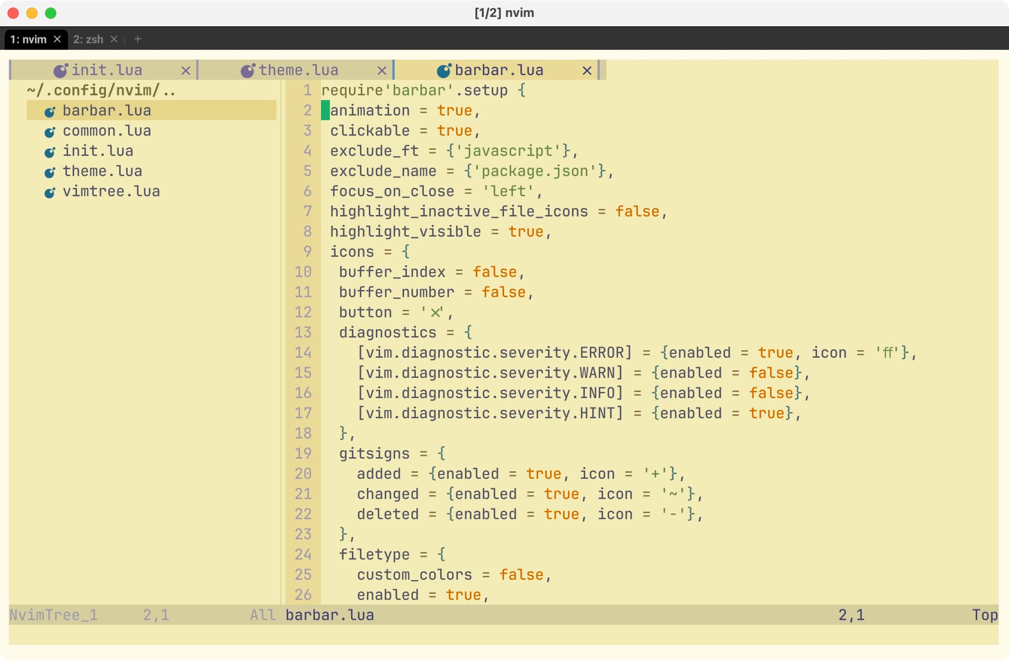Теперь добавим в редактор привычные вкладки файлов. Для этого я буду использовать плагин barbar. Создаем файл barbar.lua и добавляем туда настройки: