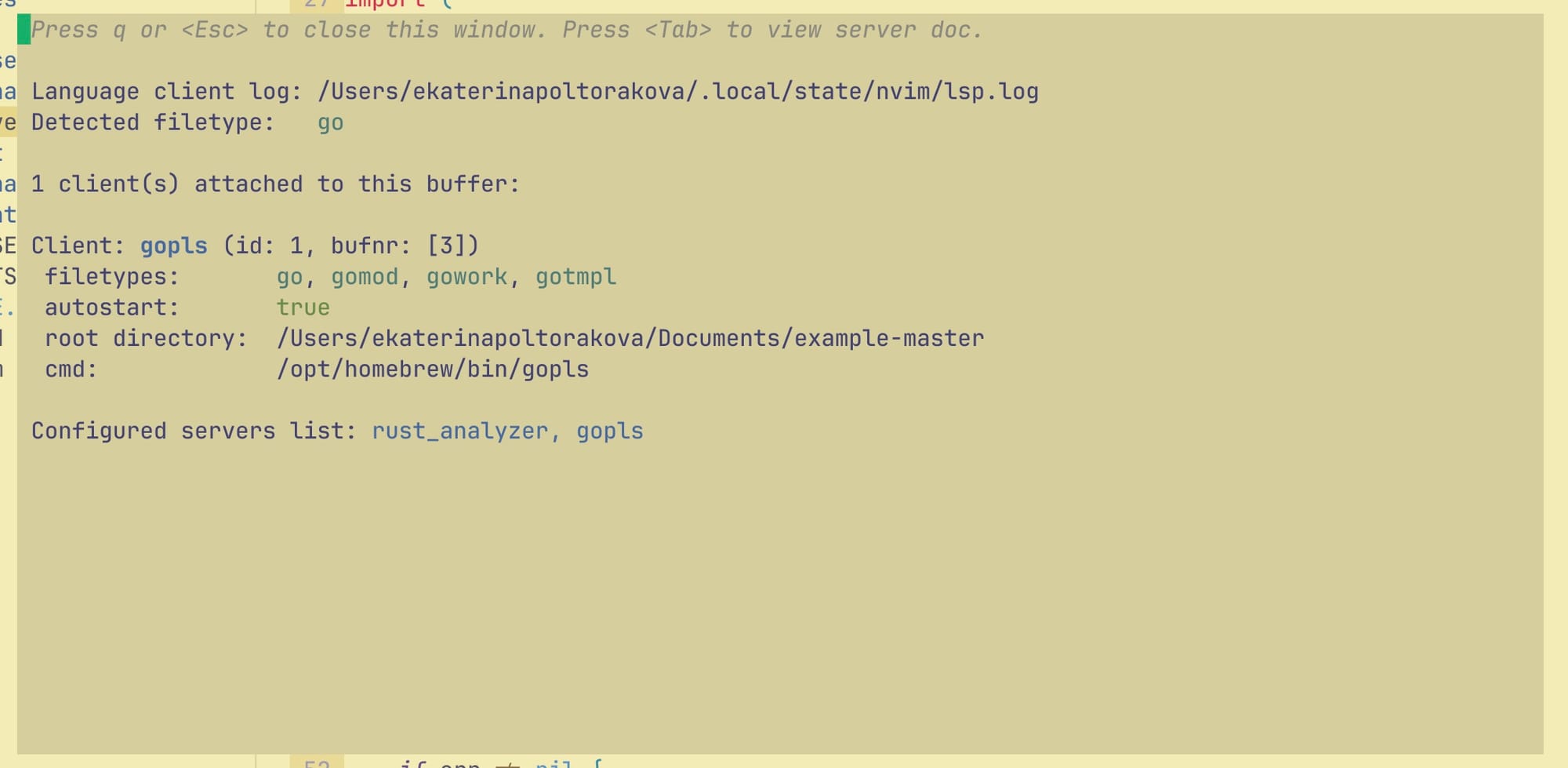 export PATH=$PATH:$GOROOT/binТеперь, открыв go код и удостоверившись, что ошибок нет, выполняем :LspInfo: